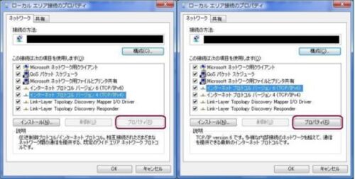 事の発端は IPv4 の「プロパティ」ボタンが押せなくなってしまったこと。(下図左側) 一方、IPv6の「プロパティ」ボタンは押せる。(上図右側) UAC やアンチウィルスソフトを無効にしても変更できないままだったので、原因は不明。 ちなみに【ローカルエリア接…
